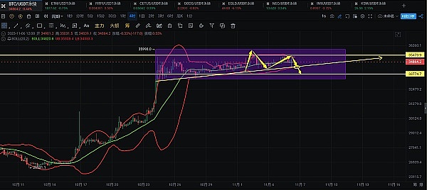 根据目前市场情况,建议在34900附近进行空单操作,目标为34425附近的趋势线支撑。若成功突破该支撑线,可以进一步看向33800。止损位设置在35350。
