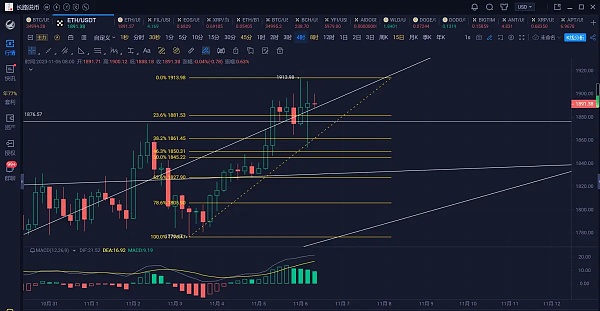 在4小时线上,行情经历了一波反弹,但在1910附近高点承压回落。目前需要重点关注下方上涨趋势线1887附近的支撑,若是跌破,行情有可能继续回踩下方斐波那契回撤线0.236处的1880附近支撑。从技术面上看,行情多次试探1910附近高点却未能站稳,在回踩支撑后再次反弹,显示出需求。对于操作策略,建议关注1900点的突破,若无突破可考虑短空进场,下方则关注1870的支撑。日线级别相对强势,需要谨慎追空,下方支撑可关注1860附近,上方阻力可关注1900和1915的突破。