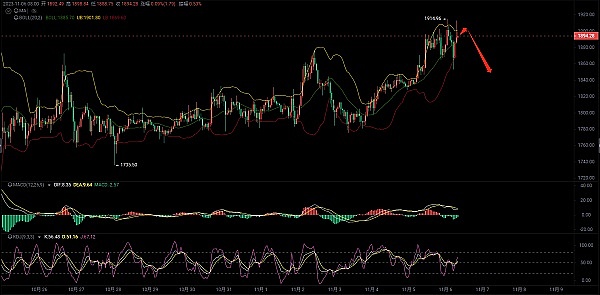 以太晚间多头多次冲高,多次插针1900试探成功打破新高到达1914一线,触及压力后开始缓慢震荡下行。从1小时图来看,BOLL布林通道上轨呈现向上开口,K线攻破上轨受阻回落至上轨下方运行,附图MACD空头能量住缓慢放量,KDJ三线向上发散。在4小时图中,币价目前运行至上轨下方,附图MACD多头放量乏力,KDJ金叉向上,短时间有小幅拉升迹象。建议反弹做空。