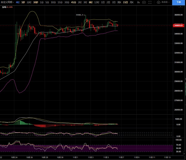 2023年11月6日下午3点10分,COINCASO网编辑对数字货币行情进行了分析。当前行情受到明显的压制,尚未突破36000的压力位,一直在高位持续震荡回落。布林带显示收口迹象,并且周末节奏也是高位宽幅震荡。短期内延续性较弱,很难出现单边行情。技术结构上,4小时级别中布林带呈平行形态,币价仍在布林带上轨处运行,并且MACD指标显示空头量能正在放大。整体趋势仍然是震荡上行,但空头较强。下方支撑位在34000附近稳固。