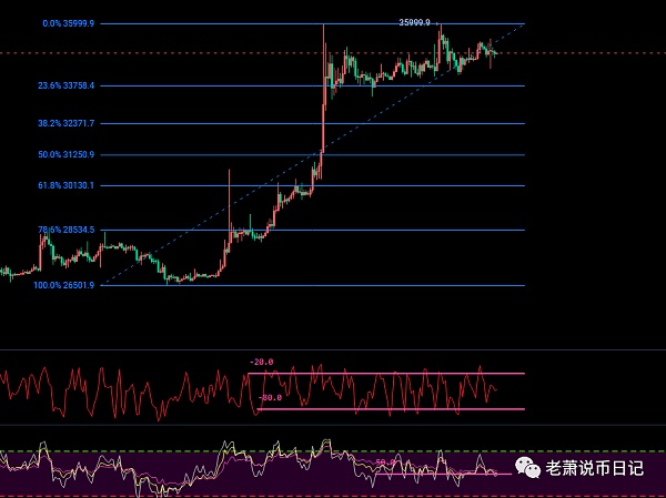 短线方面,比特币的4小时和1小时线威廉指标已经触及顶部,进入超买区。这意味着短期内可能面临一定的下跌压力。对于想做中线投资的朋友来说,可以在35000和35300分批布局,目标设定在33800。而对于短线投资者,可以在35000进场,目标设定在34600。