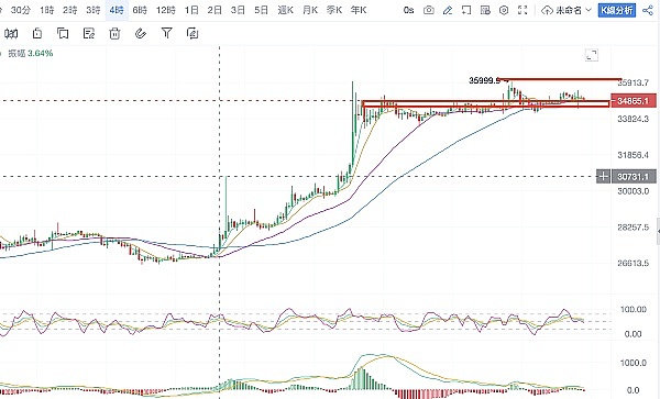 大饼的短周期K线依旧在向斐波那契线35500附近靠拢,周末行情可观。大饼从底部34000-34200区间得到支撑,会继续上行直至触及高位压力位35500附近。在到达压力位后,预计会下行700点左右,回到支撑位34800附近。大饼的支撑和压力都在之前的分析中提前公开,恭喜那些跟上丞丞思路的朋友!通过丞丞的指导和分析,这次周末行情完全可以把握住,即使之前的预测方向错误也没关系,及时止损,调整方向,确定支撑后布局多单或者确定压力后布局空单,这些都是关键。丞丞在之前的文章和视频中已经提前给出了本次行情的高低位和短线的思路。