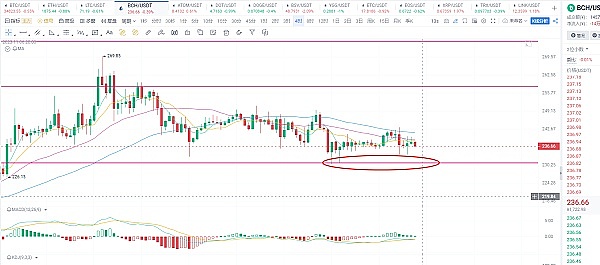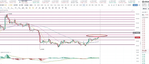 LTC目前呈现窄幅箱体,高位短线压力位在72.1附近,支撑位在67.8附近。我们在之前已经布控了这一轮反弹的格局,虽然是毛毛雨,但是从布局角度来说非常契合。突破后,我们可以看到上移至75.3附近参考的压力。