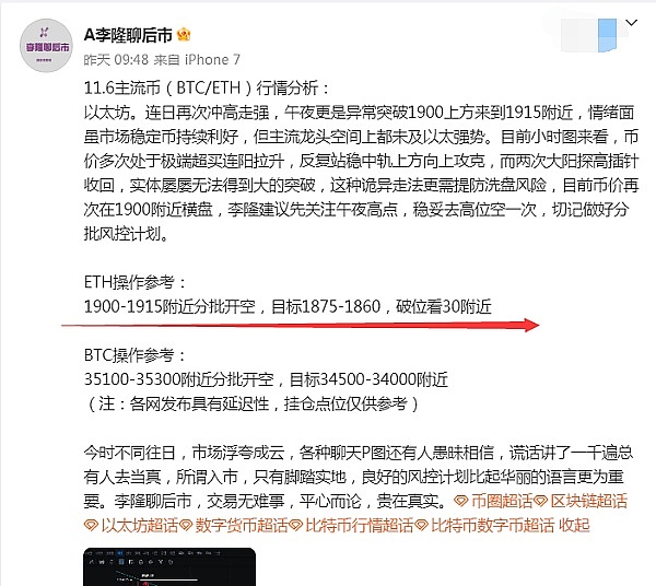 以太坊。如李隆昨日所说,反弹便是开空时,1915附近补一次,下午最低触及1866附近,最高走出近50余点的空间,点位依旧精准吻合,盘中理性稳健取舍。李隆聊后市,交易无难事,平心而论,贵在真实。