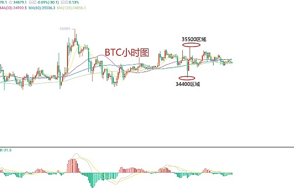 11月7日比特币(BTC)合约技术面分析:今日方面,大周期日线级别昨日报收小阳线,K线形态上单阴单阳,价格还是在高位横盘整理,附图指标却是出现快慢线粘合死叉向下,而又看不见价格的回撤力度以及延续,基本维持不动,高点压力位置36000区域,低点支撑位置33000区域;区间价格还是比较大的,所以一段时间内价格还会在区间震荡中;短周期小时图整体走势走势还是在时间修正里,高点阻力35500区域,低点34400区域,区间不破都难延续,那么这样来看我们交易思路也是维持不变,因此今日BTC短线合约交易策略:反抽35300区域空,止损35500区域,目标看34700-34600区域,回撤34600区域多,止损34400区域,目标看35200-35300区域;