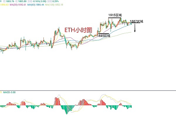 11月7日以太坊(ETH)合约技术面分析:今日方面,大周期日线级别昨日报收小阳线,K线形态上连阳上涨,价格持续保持在均线上方,附图指标金叉运行,在大周期走势上和大饼还是又非常明显的区别的,所以两者近期在交易上是不能同步的,这个要多注意,避免不必要的损失;短周期小时图高点位置1915区域附近,低点位置在1850区域附近,这是当前的区间震荡价格高低点,当前K线形态连阴,附图指标死叉向下,而时间在欧盘,价格是有回撤需求的,因此今日ETH短线合约交易策略:现价1887可以轻仓空,止损1901区域,目标看1850-1845区域;回撤1845区域多,止损1825区域,目标看1880-1900区域