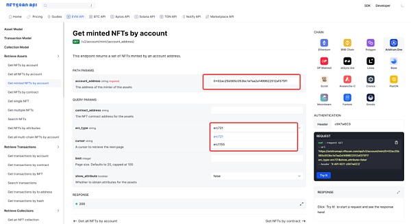 来检索一个钱包地址下的 Minted NFT 的详情信息,路径参数包括 account_address 作为选择,查询参数选择包括 erc712/erc1155 的 NFT 资产,这里我们查询的是 0x02ac25b565c053bc1e7aa2a1499622512af375f1