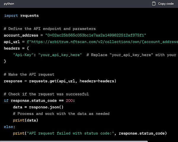 当开发者在 NFTScan 的 API 文档中找到所需的 Arbitrum API 接口和参数后,可以使用他们选择的编程语言(例如 Python、Java、JavaScript 等)来编写 API 请求代码。以下是一个示例,演示如何使用 Python 来请求一个钱包地址