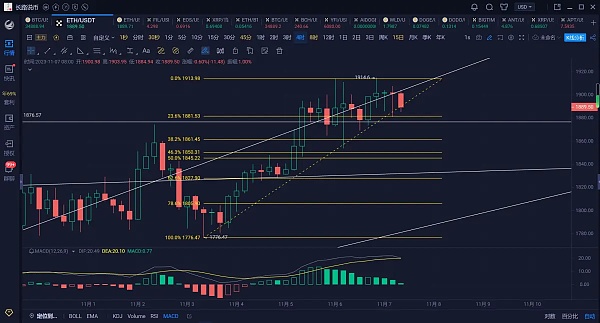 以太坊上个交易日走出1915的高点,白盘反弹1910承压回落1870附近获得支撑再次反弹,在晚盘最高涨至1915一线回落,美盘主打的是一个震荡。