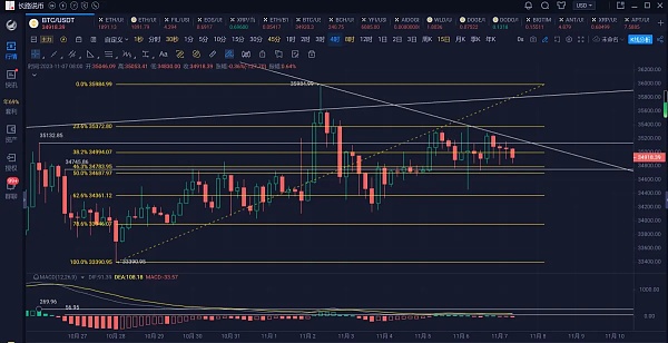 大饼自走出36000高点后,再次回踩测试34000附近支撑反弹,连续多日位于高位震荡并未走出高点,随着日线布林带的缩口及技术指标都有向下运行的态势,MACD已经形成死叉,若是跌破34000的支撑,那么将有机会去测试中轨33500附近的支撑,4小时线大饼同样反弹无力,昨天上下插针而后连续回踩,多日的高位震荡,上行的量能有所减弱,大家操作上也可以以反弹空为主,下方可关注34500附近的支撑.山岗则关注35200附近的压制。