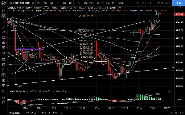 以太坊昨日回踩至1883一线走出反弹,行情连阳上行破位前高至1914一线受阻回落,恭喜跟上高空思路的朋友,目前币价在1890附近运行,四小时级别行情沿ma14均线持续上行,虽再破前高但延续性不强,短期形成顶背离走出回落,目前处于ma7均线下方运行,反弹力度不大,macd多头转空双线有死叉迹象,整体呈高位震荡,日线级别近期呈单边走势,虽形成双顶但回踩力度不强,有再度冲高的可能,还是那句话上方空间不多,整体以逢高做空为主低多为辅,上方压制1930-1970,下方支撑1865-1830