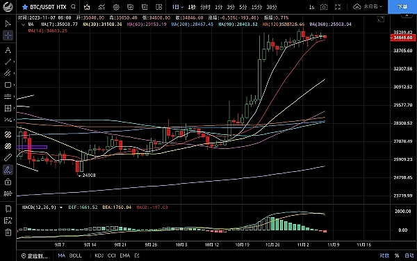 大饼昨日虽冲高但未走延续,行情震荡回落,低位跌至34731一线支撑反弹,目前币价在34870附近运行,恭喜跟上昨日思路的朋友空单获利500点,四小时级别行情反弹高点逐步降低,macd空头运行双线粘合有死叉迹象,k线连阴回落,多根均线缠绕,短期呈震荡走势,偏向空头,有试探34400支撑的可能,日线级别呈高位震荡,macd多头转空双线死叉,整体走势来看存在回调需求,日内建议反弹高空为主低多为辅,上方压制35300-36000,下方支撑34400-34000
