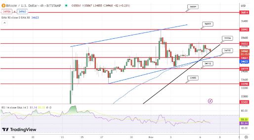 在当前的交易环境中,比特币徘徊在 34,918 美元附近,在最后一天出现小幅波动。价格结构的核心是枢轴点,该点位于 34,662 美元,为当前交易日的价格变动提供了基线。