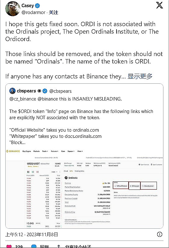 Ordinals的创始人Casey Rodarmor在Twitter上讨论了币安对ORDI的支持,并澄清了代币与协议之间的关系。他指出,该交易所错误地将Domo的代币称为"Ordinals",并错误地将ordinals的链接认成ORDI的"官方网站",更表示:“ORDI与Ordinals项目无关,我希望这个误解能够尽快得到澄清。”