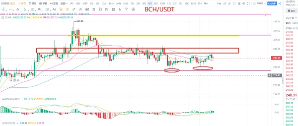 BCH4小时图来看昨日最低为的回落线还是保持在231的上方运行,并且今天的凌晨冲高至244附近了,从K线图来看244-247这个区间段短线会有一定的筹码阻力,但趋势我们依旧认为只要币价保持在230-232上方运行,那么本轮箱体的头部筹码高位预计还是会围绕258-260这一代运行。给到机会可以做一些尝试即可有不明白的地方也可以再来问我。