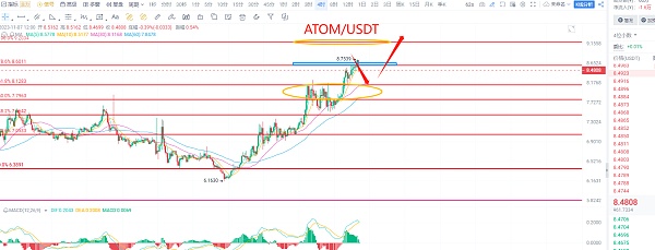 ATOM日线结构目前出阴柱从整个走势来看拐点并未明确出现,但从短线回落的角度来看 已经处于明显的指标偏离需要修正做合理的小幅度回踩是正常的,结合盘中4小时图来看我们在昨天给到的两个压力点的分享,第二压力位是9,2附近,那么目前处于明显的第一压力位8,62压制开始回落,布局上做好防守目标我们依旧参考8,28-8.13短线出局较为合理。为了保守期间我们在下方7,8附近在设伏一次,给到机会可以做一些尝试即可有不明白的地方也可以再来问我。