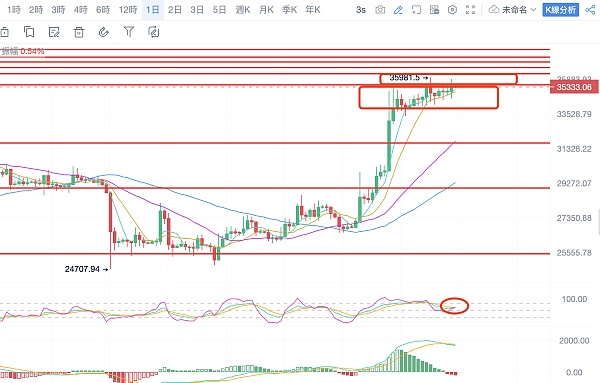 就目前行情,做个简单更新,首先从大饼来看依旧是出于箱体结构,不论是前期的低位34000-34200,还是目前的窄幅震荡支撑34500-34700附近,都是属于结构箱体未破,只需关注结构内的支撑与压力,基本上就没有什么问题,止损带好破位被扫又如何?前期已经吃了无数次利润,思路理清,做单很简单。四小时图看大饼还是尝试性的继续靠拢3600-36200这个压力位,多次接近斐波那契线,而下方MA30日均线/60日均线同步上行走缓,行情并未偏离较远,,日线KDJ三线中部粘合拐头朝上,综合来看丞丞认为短周期能还会出现小幅回落,而后继续试探3600-36200附近直至破位,上看37600-37800附近,底部支撑可以关注一下33400-33600附近。