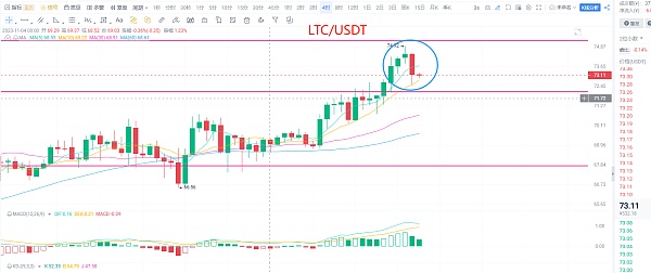 LTC4小时图来看高位给到的参考75已经到达,然后开始短线回落到箱体第一支撑位72附近 ,那么目前来看均线结构没有破位,并且价格还是在保持72上方运行,有筑底的迹象。目前给到的箱体参考依旧是75-72较为合理,给到机会可以做一些尝试即可有不明白的地方也可以再来问我。