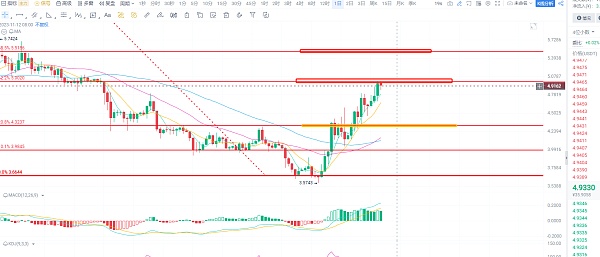 DOT4小时图来看短线高点受阻5,0,昨天已经提前把思路都给到,但目前回落的空间较小并且K线图的走势情况依旧是保持在均线MA5-MA10范围内运行,多头的结构目前还没有进行破位,那么逆势空就需要做好防守在去做尝试,短线4,8-4,6观察力度决定能否离场,箱体结构线第一支撑点我们给到参考4,3附近给到机会可以做一些尝试即可有不明白的地方也可以再来问我。