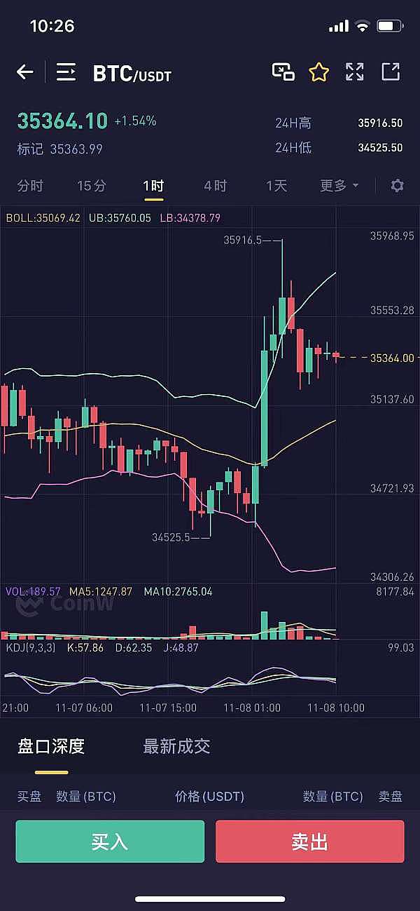 恭喜,行情暴涨,昨晚比特币在34758现价布局的多单,完美到达止赢目标35260,止赢500点,太给力了!