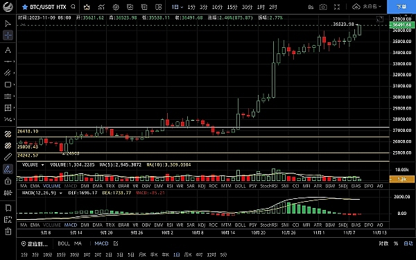 大饼昨日波动不大,整体以震荡为主,低位跌至35097一线支撑反弹,随后行情震荡上行,高位触及36523一线受阻,目前币价在36300附近运行。四小时级别近期走势以横代跌多次试探下方支撑都未跌破,目前行情加速向上拉升突破新高,短期受阻回落但力度不大,macd多头运行双线金叉向上,k线处于ma7上方均线抬头,短期走势偏向多头,日线级别行情虽再次上行但macd量能未跟随,盘面来看有形成顶背离结构的预期,上方空间不多了,思路建议围绕37000上方高空为主低多为辅,上方压制36700-37450,下方支撑36000-35600