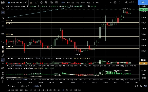 以太坊昨日白盘回踩至1872一线后震荡上行,高位触及1926一线受阻回落,目前币价在1915附近运行,四小时级别行情整体处于ma30上方运行,虽有插针但实体没有破位,macd空头逐步缩量双线粘合有金叉迹象,k线站稳ma30后加速拉升,行情走势偏向多头,仍有向上破位的需求,日线级别呈单边上行,多头表现强势,大饼突破新高后关注以太坊能否走出补涨,上方空间不多行情出现加速就是进空的机会,思路建议逢高做空为主低多为辅,上方压制1950-2000,下方支撑1880-1860