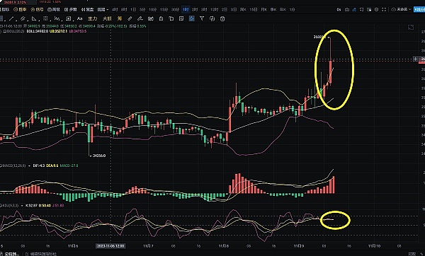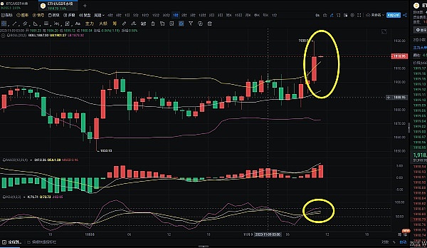 昨天早间洪伟给出反弹看空,震荡一天的行情最后获得一波小盈利,今早行情突然拉升,大饼达到36900附近,以太近期新高1930,已破BOLL轨道上轨,KDJ运行在超买区附近,MACD金叉运行有拐头向下趋势,结合数据分析,午间行情还是会有上涨的空间,但是总体洪伟还是偏向于反弹高位看空。