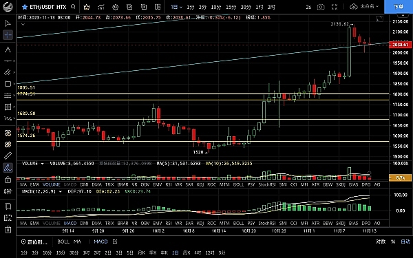 以太坊昨日整体围绕2040上下震荡,晚间二次下探迅速反弹。目前币价在2050附近运行,四小时级别行情受MA7均线压制,MACD空头运行双线死叉向下。短期有回踩需求,下方关注2020支撑情况。日线级别呈高位震荡,若36400不破,行情仍有上行需求。日内建议先看回踩,上方压制2070-2100,下方支撑2020-2000。
