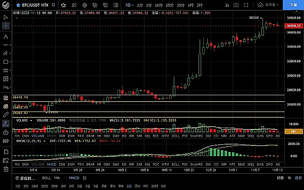 比特币昨日早间跌至36660一线支撑反弹,白盘整体波动不大呈横盘震荡。目前币价在37150附近运行,四小时级别行情沿ma7和14均线上下波动,幅度不大,均线走平。MACD空头运行双线死叉向下,短期来看行情有回踩需求,下方关注36750-36400的支撑区域。