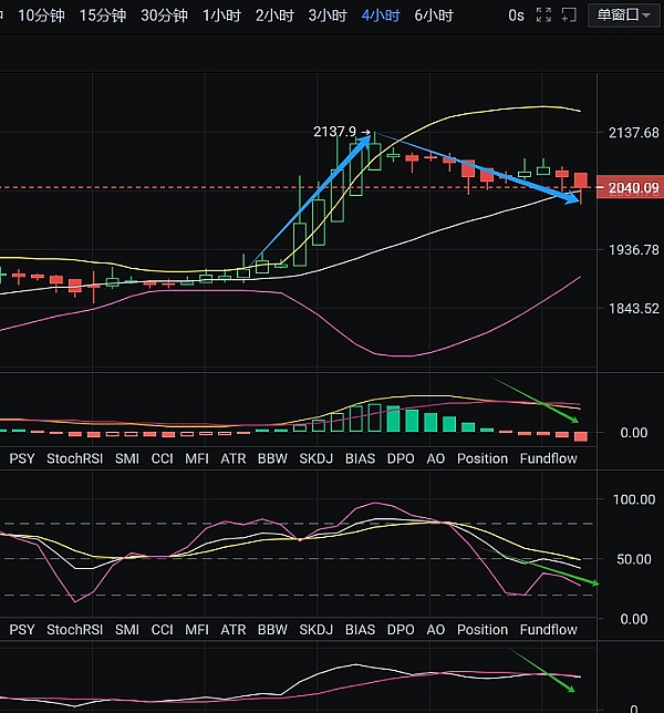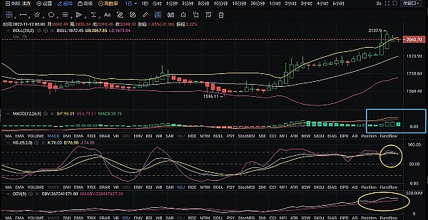 在4小时级别的走势图中,价格从2137附近震荡下行,目前突破了中轨支撑位,下跌至2040附近。MACD指标显示快线下穿周期线,0抽下方成交量有放大的迹象。KDJ指标中的J线在K线、D线的下方持续反转下穿,暗示局部走势可能继续偏空。OBV指标同样显示多头势能在减弱,存在震荡走低的风险。
