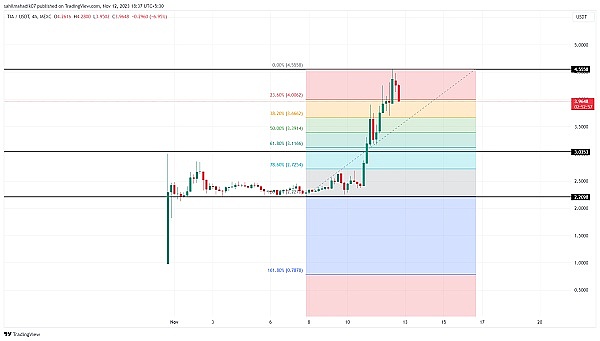 此外,由于多根蜡烛显示价格持续下跌,看涨卷土重来的可能性更大。另外,如果价格能够突破4.55美元,有望延续上升趋势并成功突破5美元的心理关口。另一方面,在回调阶段,可能会达到38.20%的斐波那契水平,即3.66美元。