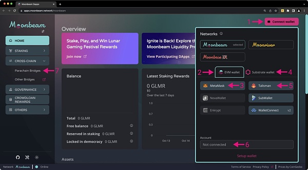 ? 首先导向至http://moonbeam.network,点击“Launch App(启动应用程序)”和“Connect Wallet(连接钱包)”。请确认您使用的是Moonbeam界面,而不是Moonriver或Moonbase Alpha。
