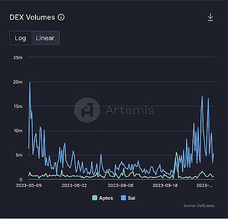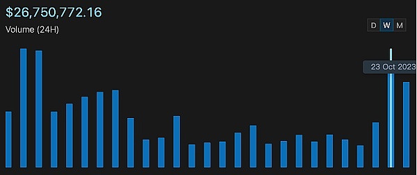 尽管代币价格走势不佳,但这并未影响Sui链上生态的蓬勃发展。TVL方面,Sui在8月份的一个月内从1270万美元增长到2450万美元,实现了一倍的增长。在接下来的两个月内,TVL呈指数增长趋势,于11月2日达到历史最高值,达到了8430万美元。与此同时,链上交易量方面,Sui自上线以来一直表现优于同为Move语言公链的Aptos,在九月底迎来了一波指数级的增长。