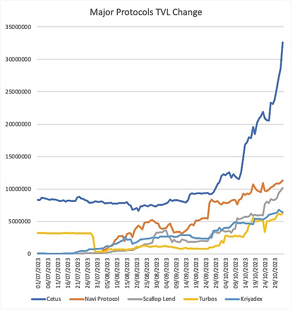 Sui链十月开始,高APY与TVL不足形成矛盾,需求激增推动SUI交易