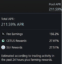 Cetus的增长核心是由SUI/USDC交易对高交易量导致的超高APY,真实的手续费收入达到了156.2%,占总APY的211.59%的绝大部分。