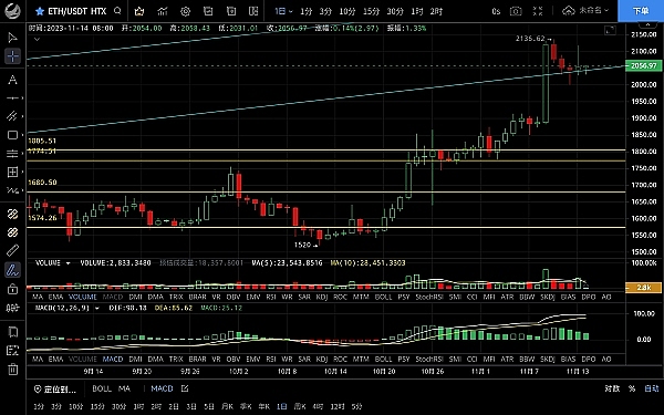 以太坊昨日白盘波动不大整体围绕2050上下波动,低位跌至2028一线支撑,晚间行情冲高至2117一线受阻回落,恭喜跟上昨日思路的朋友多空双吃获利140点,目前币价在2055附近运行,四小时级别虽再次上探但macd未跟随,k线收十字走出一波回踩,价格跌至起涨点,macd依旧是空头运行双线死叉向下延伸,2020支撑未破位短期将会走出一波反弹,日线级别盘面来看若形成阴包阳结构后市预计会一波下跌,目前多头逐步缩量上方阻力较强,想要突破有一定难度,重点关注日线收线,思路建议高空为主低多为辅,上方压制2070-2100,下方支撑2020-2000
