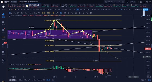 以太坊行情分析:昨天长路有提到如果行情无法站上周线上轨附近的压制,那么将会有一波回踩,但是万万没有想到价格直接打到了5日均线附近才止住跌势,日线级别也像长路所说的一样,前天走出锤子线后如果今天走个大阳线,那么将有机会形成黄昏之星的态势行情将引领下跌走势,果然行情非常给力,走出了长路所预想的趋势,从技术面上看,价格插针中轨支撑反弹受到上方均线的压制,仍有继续下探的趋势,而MACD也有形成死叉的态势,若是走出死叉,那么将继续下探1910附近的支撑。