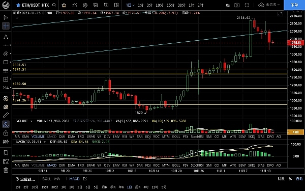 以太坊昨日走势与大饼一致,白盘反弹至2064一线后受阻回落,低位跌至1930一线支撑反弹,恭喜跟上昨日思路的朋友空单获利100点,目前币价在1975附近运行,四小时级别行情大阴回落跌至ma90均线支撑迅速反弹收线在ma60下方,短期受ma60压制虽有反弹但力度不大,macd空头逐步放量双线死叉向下延伸,ma7拐头向下,整体走势空头占优,日线级别下方还有空间,短期的会预计会走震荡,随后会再次下跌,若1900支撑不住关注1830附近届时会有一波好的反弹,日内思路建议反弹高空为主低多为辅,上方压制2000-2030,下方支撑1930-1900