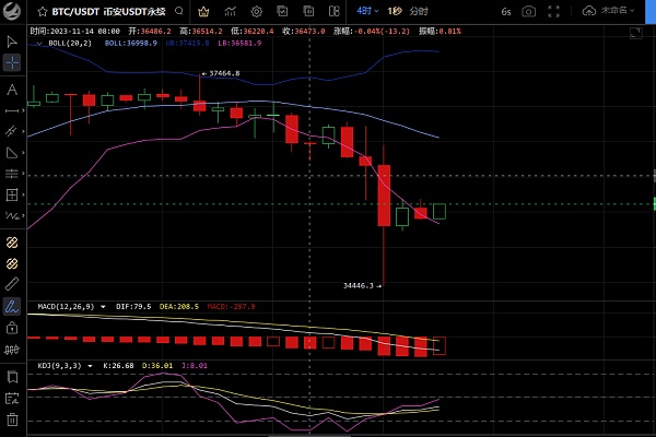 四小时技术结构图看,行情运行于下轨上方运行,布林带呈开口走线,MACD快慢线向下延伸但有略微拐头迹象,KDJ三线有形成交叉向上的趋势,从整体走势结构来讲,浪形结构也已经走完会进入新的走向,日线图来看,连阳上行过后,反之走出连阴下跌 画了个小门 午夜的的插针刺破中轨后再收回来并未形成有效的延续。虽然击穿36200的支撑,但是在35000的支撑还是很强的,来了一波大的回调后,肯定会有一波反弹,所以近期的方向操作建议回调低多为主高空为辅。