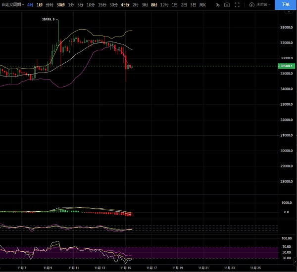 从4小时线来看的话,行情做出了市场框架的转变,由原本的多头,转变为空头。布林带呈张口状态运行,K线延下轨持续震荡,走势呈拱桥势,下方MACD空头能量柱放量,MACD向下延伸,KDJ三线有形成交叉向上的趋势。目前空头也是相对于来说比较强势,币价在短期的低位,空头也是有占据主导市场的趋势,在多次突破36000关口之后,大概率还会延续一波下探, 留意日K线的结构变换,目标小周期处于高位回调中显弱,大级别还是多头,回撤就是机会,思路继续低多为主,高空为辅即可
