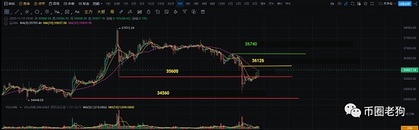 从小时级别来看,走势和昨天老狗预想的基本一致,在今天凌晨2:00,大饼最低价格来到了34800,价格跌破了近期低点35600。从指标上来看目前一小时级别K线站稳了5 10MA上方,短期处于多头趋势。但是目前价格却又被上方36126一线小时级别大阴线高点压制,所以短期如果价格没有站稳36126的话,价格将会再次回踩日内低点。如果跌破日内低点,下一价格关注34560附近支撑位置。