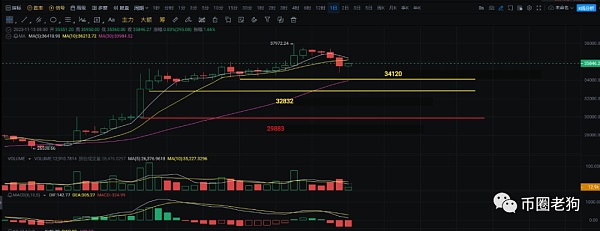 从日线级别来看经过昨晚一晚上的K线运行,昨日大饼日线级别收了一个量能较大的阴线,并且价格已经实体跌穿了日线级别5 10MA,短期日线级别确认了空头趋势。价格大概率会下探34120-32832附近支撑。不过老狗个人认为如果大饼的日线级别确认了空头趋势,未来几天日线级别大概率会出现一个量能较高跌幅较大的阴线,很有可能会插针红线支撑位29883附近,所以手中有多单的朋友一定要控制好止损。