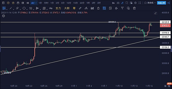 11月16日比特币(BTC)合约技术面分析:BTC今日走势结构上看,大周期日线级别昨日报收大阳线,K线形态上连阴单阳,价格上基本抹平了前几日的跌幅,再次回到高位;指标上看依然死叉向下运行,如此市场冲击的行情指标走势就显得比较无奈了,市场或许也是在等待明天的市场冲击;短线走势上看,数据冲高37500修正,日内开盘冲高38000承压,延续性并不是很明显,当前K线形态连阴,附图指标死叉向下,这样来看承压回撤的欲望还是比较明显的,交易上就不能直接多。因此今日BTC短线合约交易策略:回撤37200区域多,止损36800下方区域,目标看37600-37800区域;反弹37800空单进场,止损38200位置,目标关注37300-37200区间。