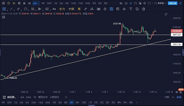 11月16日以太坊(ETH)合约技术面分析:以太坊ETH走势结构上看,大周期日线级别昨日报收大阳线,K线形态上阴阳交替。价格上基本是抹平了前日的下跌幅度,继续在高位盘整,指标上同样还是没有转变过来,也就没有啥实际参考价值;短线走势上昨晚冲击2100上方再次承压回撤,冲高是因该的,昨天的分析上也讲的比较清楚。今日开盘走势早间承压回撤,高点位置在2080区域附近,当前K线形态连阴,继续回调需求还是比较明显的。因此今日ETH短线合约交易策略:回撤2025附近多单进场,止损2000下方区域,目标看2065-2085区域;反弹2085空单进场,止损2108位置,目标关注2035-2020区间。