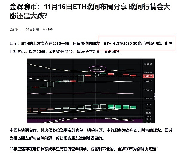 金辉聊币:晚间给大家的布局建议 以太在2080的空单 完美拿捏