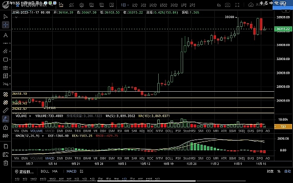 大饼昨日两次试探36600上方都未曾站稳,随后走出回落,低位跌至35800附近支撑反弹,恭喜跟上昨日思路的朋友空单获利800点,目前币价在36400附近运行,四小时级别短期形成窄幅震荡,上方36800,下方35500,macd空头缩量双线粘合,ma均线走势凌乱,盘面来看虽底部在逐渐抬高但高点同样也在降低,短期走势没什么太大变化,日线级别依旧是空头走势,macd呈死叉向下,若收线在ma7下方预计还有下探的可能,周k形成双底始终未突破新高,后市再不破前高的情况下反弹高空为主,周末波动不大建议高空低多对待破位持有,上方压制36700-37300,下方支撑36000-35500