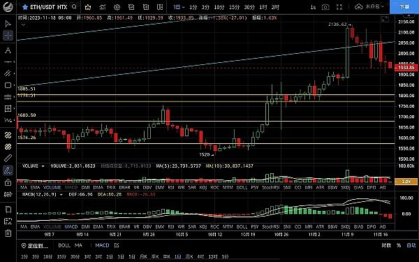 以太坊昨日整体表现较弱势,早间高位触及1991一线后阴跌回落,低位跌至1905一线支撑反弹,恭喜跟上昨日思路的朋友空单获利80点,目前币价在1930附近运行,四小时级别行情触及ma120均线支撑反弹,但力度不大,上方受ma90压制,行情再次回落,macd空头运行双线死叉向下延伸,预计还有破位的可能,日线级别来看k线收大阴且没有影线,日内行情上探未能突破压制,可见空头还是挺强的,有试探1860支撑的可能,思路建议反弹高空为主低多为辅,上方压制1960-2000,下方支撑1900-1860