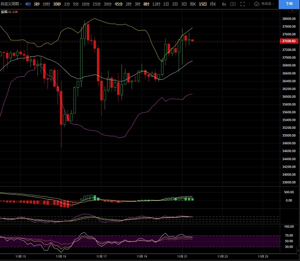 从四小时来看,布林带持续开口运行,三轨均平行上扬,币价延上轨高位震荡修整,收两根长的下引线,而下方KDJ三线上扬后下探有交叉之势,MACD多空能量柱放量运行,虚实转换,也是符合走势,多空来回博弈。昨天连续向下插针,收两根长的下引线,但币价始终都没有跌破36500的中枢上沿的位置,而是价格插针下探后收复延续在中轨上方盘整,运行通道保持向上微张状态,多头量能保持着排列,均线迁回式扬,小周期保持盘整式走高,下方支撑逐步上移,说明多头趋势明显,市场购买力也是非常的强势,短期回调的话依然还是看36500是否能够支撑得住,支撑住那么还是能够继续上升,创新高的概率依然很大,耐心等待即可。