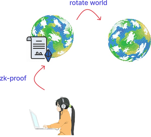典型的 ZK 应用流程。对于形状旋转器来说,这是一个容易理解的例子。用户计算 ZK 证明,证明他们已经计算出世界的有效旋转。他们将此证明提交给管理链上世界的验证者合约,以及一组新的坐标和世界旋转更新。将会观察到一个玩家有可能发起一场全球性的变革。
