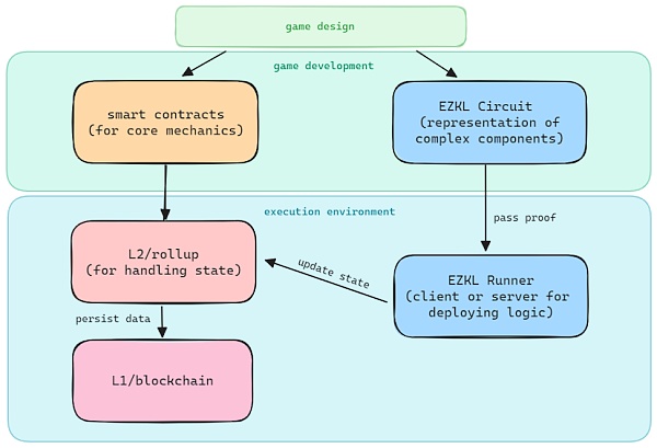 我们相信这些范式之间的折衷是可验证的链下计算和链上状态管理。在实践中,这是通过 ZK 等专门的区块链解决方案来实现的,更具体地说是 ZKML(Zero-Knowledge Machine Learning 零知识机器学习):针对高质量游戏体验所需的复杂操作进行优化的基础设施。